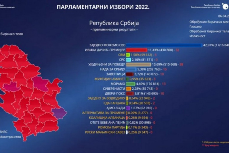 Na osnovu obrađena 7.878 od 8.273 biračka mesta objavljeni su rezultati za.